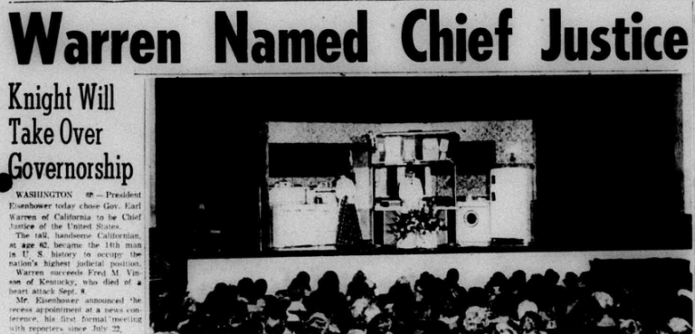 Former California governor Earl Warren was named Chief Justice of the US Supreme Court. The Warren court would make a number of landmark civil rights decisions, such as Brown v. Board of Education (1954).