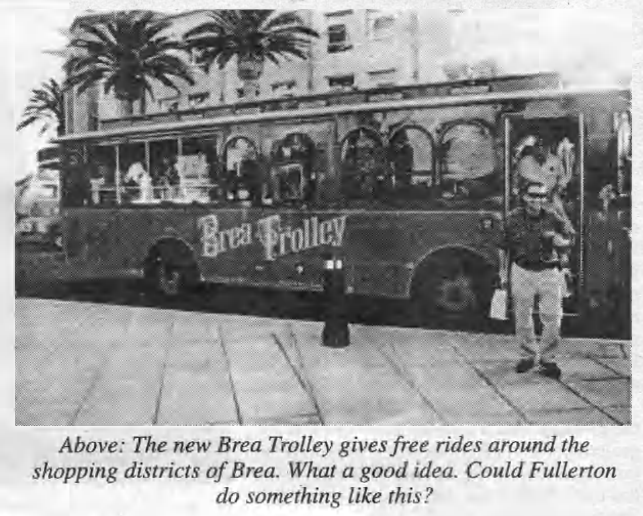 In (somewhat) positive news, a new Brea Trolley offered free rides to Birch Street. It wasn’t really a trolley, but a bus made to look like a trolley, and it didn’t last long.