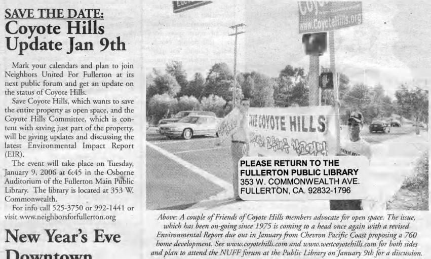 The Fullerton Observer newspaper was formed in 1978 by Ralph and Natalie Kennedy and friends to provide a more progressive counterbalance to the more conservative Fullerton News-Tribune and Orange County Register. Back then, Orange County (including Fullerton) was dominated by Republicans, and the Observer crew were definitely in the minority. The Fullerton Public Library has digital archives of the Observer stretching back to 1979. I am in the process of reading over these archives and creating a year-by-year summary of top stories. Here are some top stories from 2005.