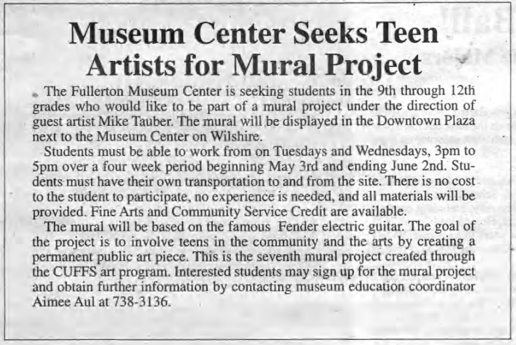In art news, the Fullerton Museum Center was looking for young artists to help with a mural on the parking structure that sits on the former Fender Instruments Factory. The mural depicts Leo Fender and his musical legacy.