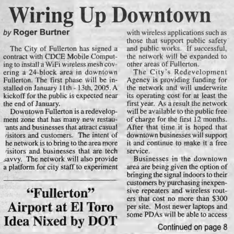 In 2005, Fullerton experimented with free downtown wi-fi service covering a 24-block area.