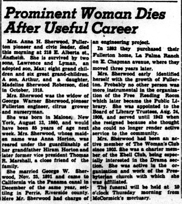 1926: Jennie Des Granges, wife of pioneer Otto Des Granges. A native of Tennessee, Jennie came to Fullerton area in 1869. She was the oldest daughter of James Gardiner, another Fullerton pioneer. Their children were Paul Des Granges and Marie Brewer. Her brothers were John R. Gardiner, Lilburn Gardiner, Frank Gardiner, and W.A. Gardiner.