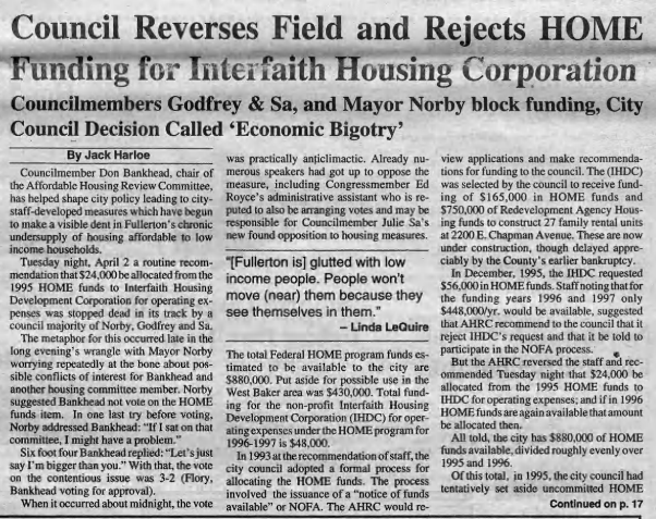 The Fullerton Observer newspaper was formed in 1978 by Ralph and Natalie Kennedy and friends to provide a more progressive counterbalance to the more conservative Fullerton News-Tribune and Orange County Register. The Fullerton Public Library has digital archives of the Observer stretching back to 1979.